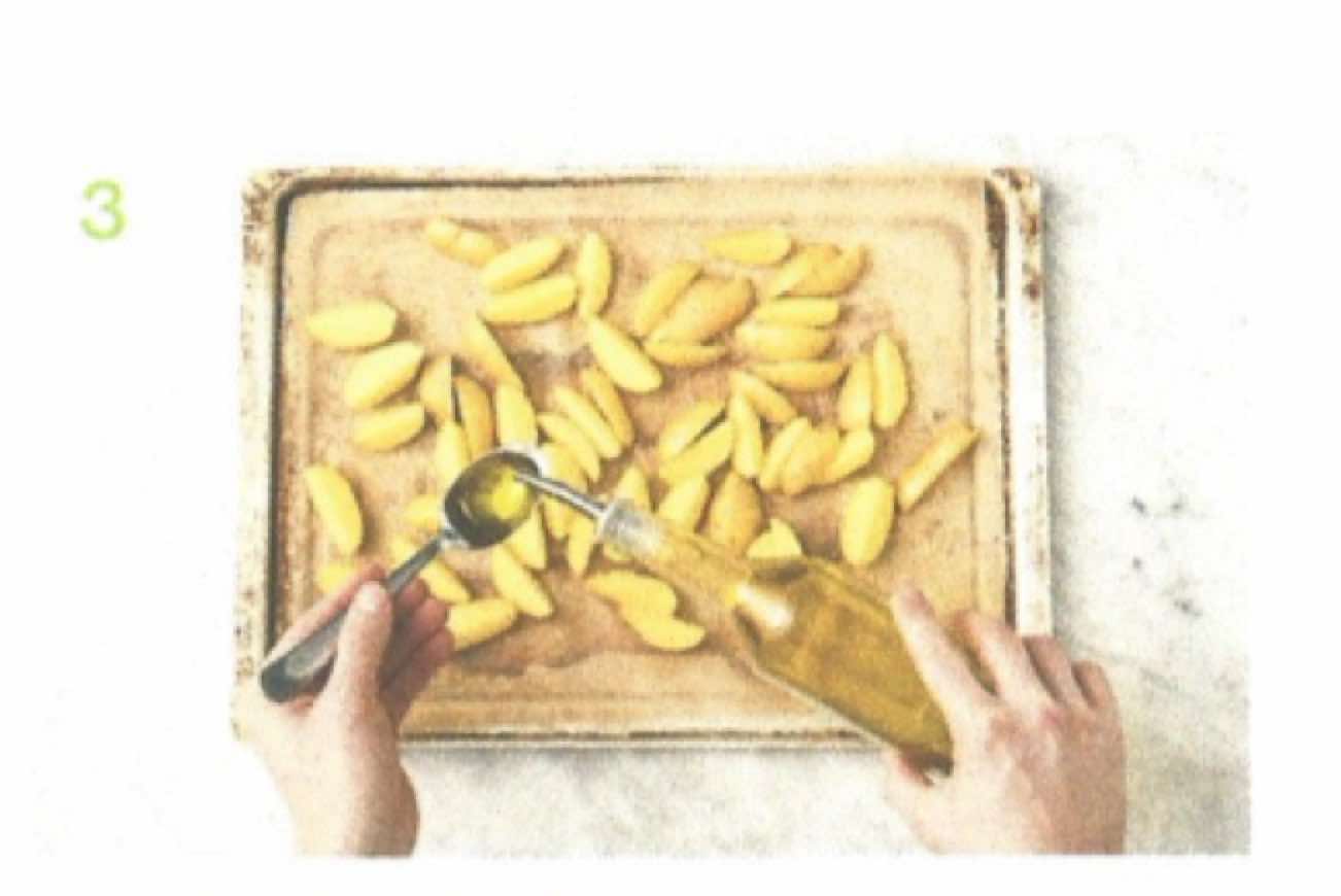 Die Kartoffelspalten auf einem mit Backpapier belegten Backblech verteilen, mit 1 EL [1,5 EL | 2 EL] Olivenöl beträufeln, mit Salz und Pfeffer würzen und für 25-30 Min. im Ofen goldbraun backen.